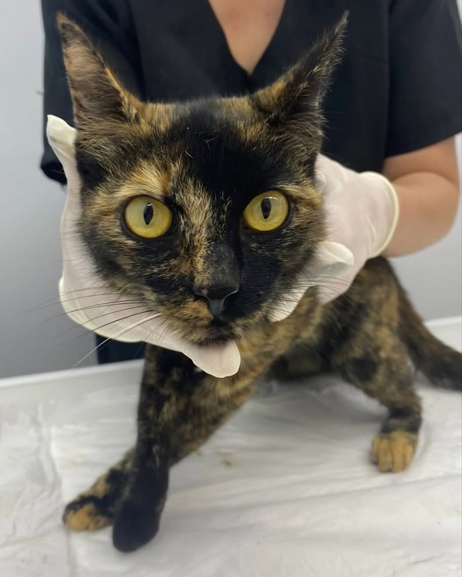 Fui resgatada após ser encontrada com cerca de 10 cm de intestino para fora pelo ânus (prolapso retal), eu estava com muita dor, hipertensão e frequência cardíaca aumentada. As tias vets fizeram um procedimento para colocar para dentro. Também tenho uma pedrinha na bexiga, se não se dissolver com a alimentação adequada será feita cirurgia.